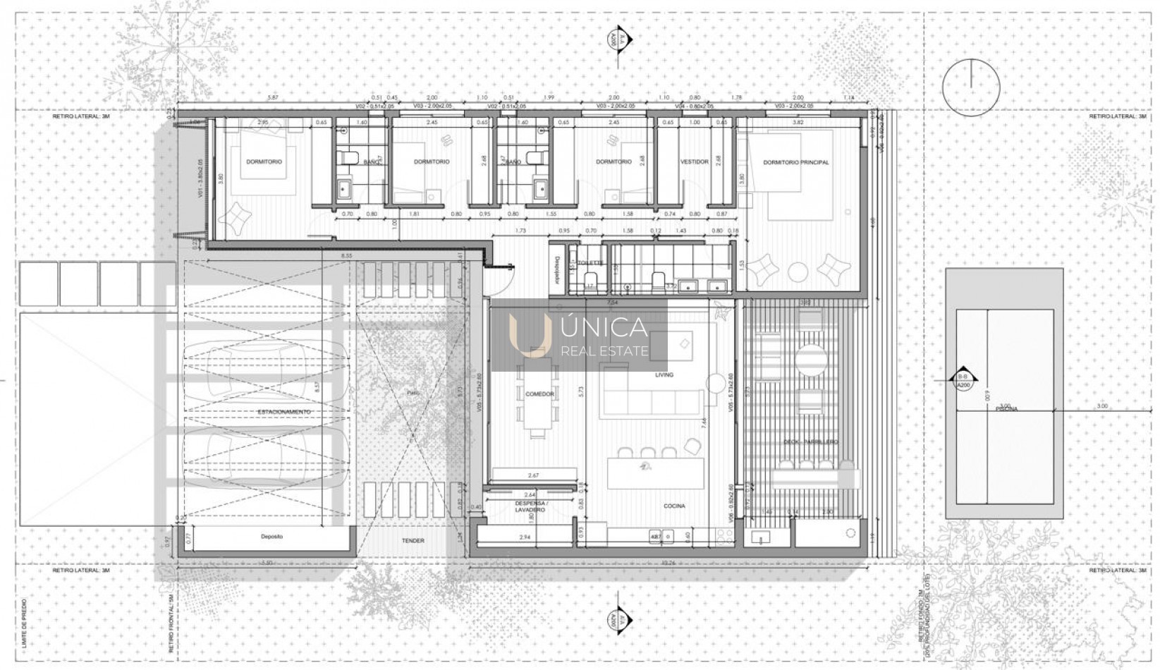(185 m² interiores + 40 m² exteriores + 20 m² piscina)