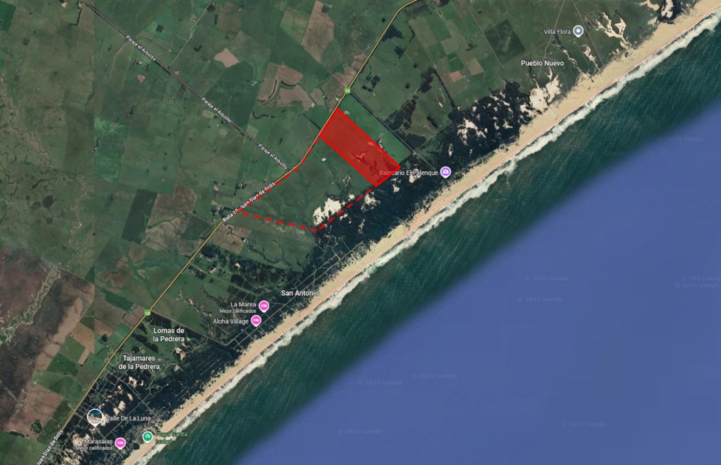 De un lado se recuesta sobre la ruta 10 y del otro sobre la zona de médanos y playa.