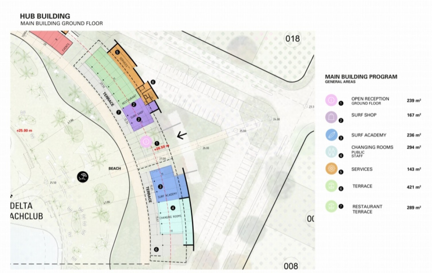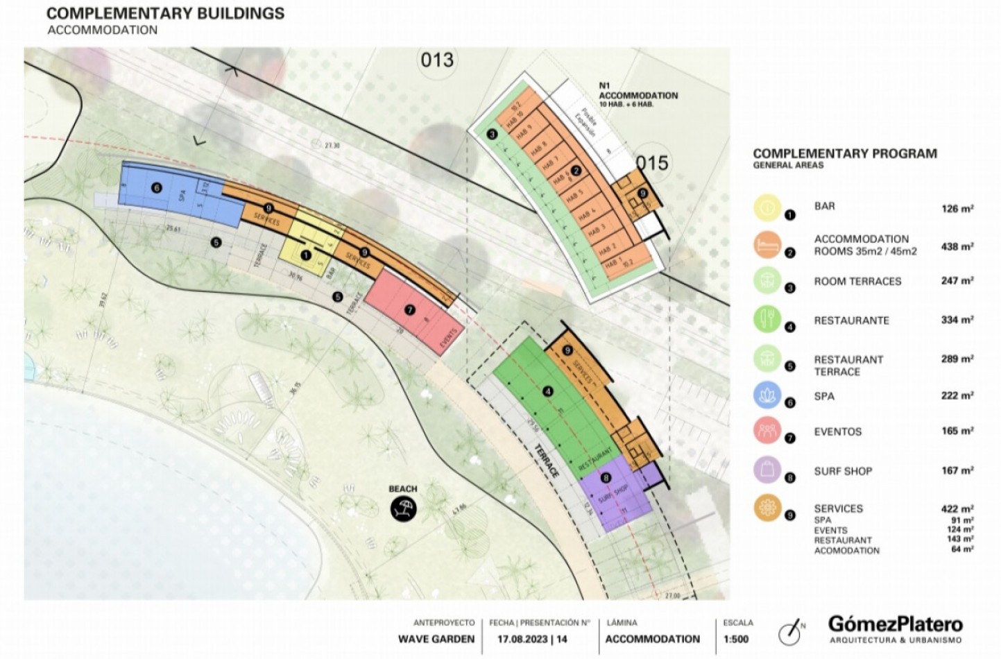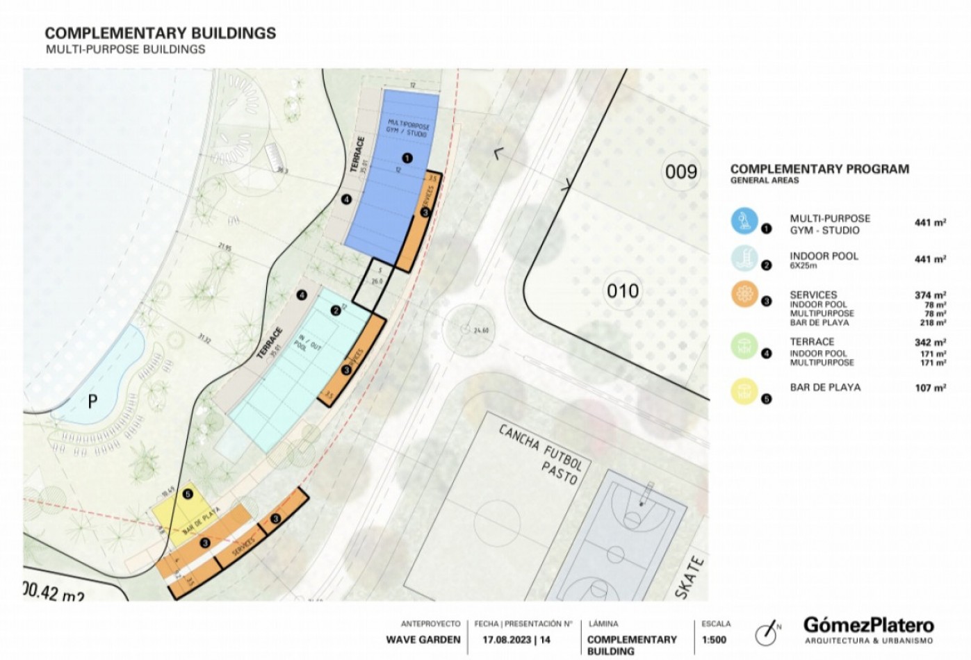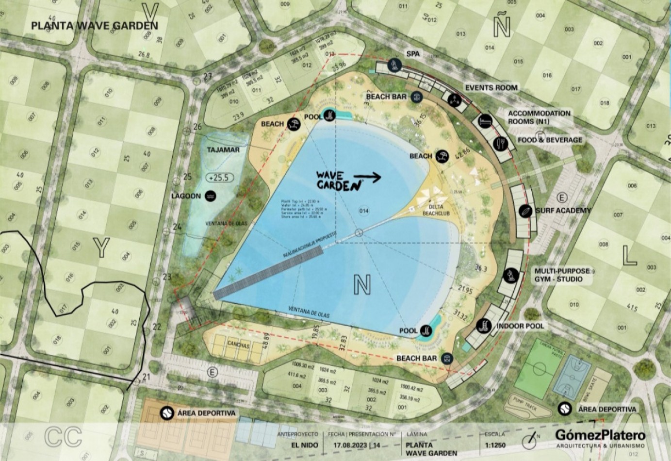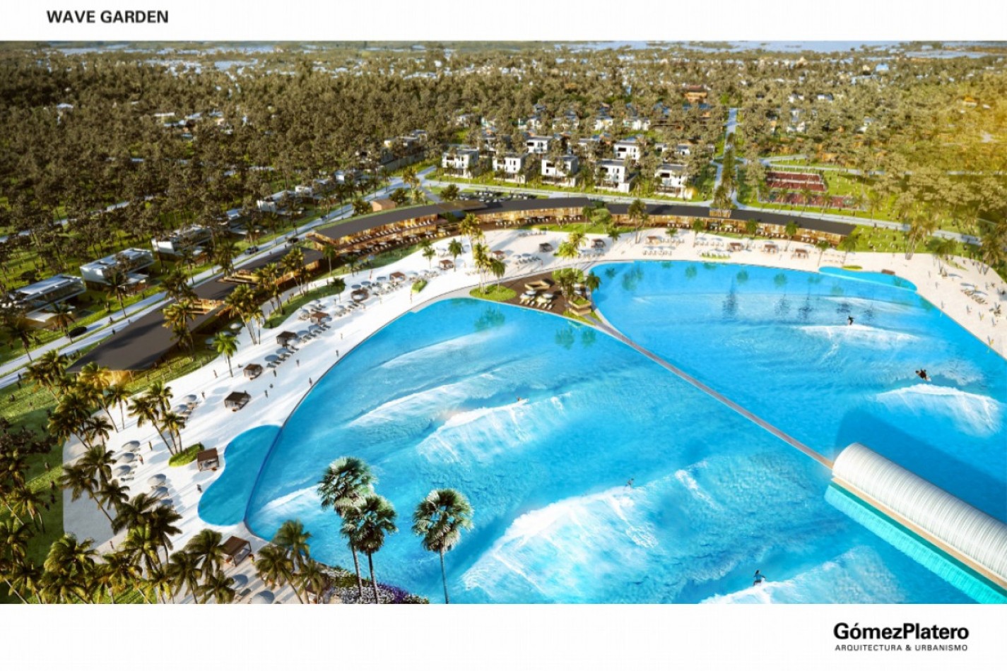 Además spa, gimnasio, vestuarios, skatepark, lago para SUP, senderos de trekking, Kids Club, restaurante, bar, tienda de surf & skate, y una huerta comunitaria.