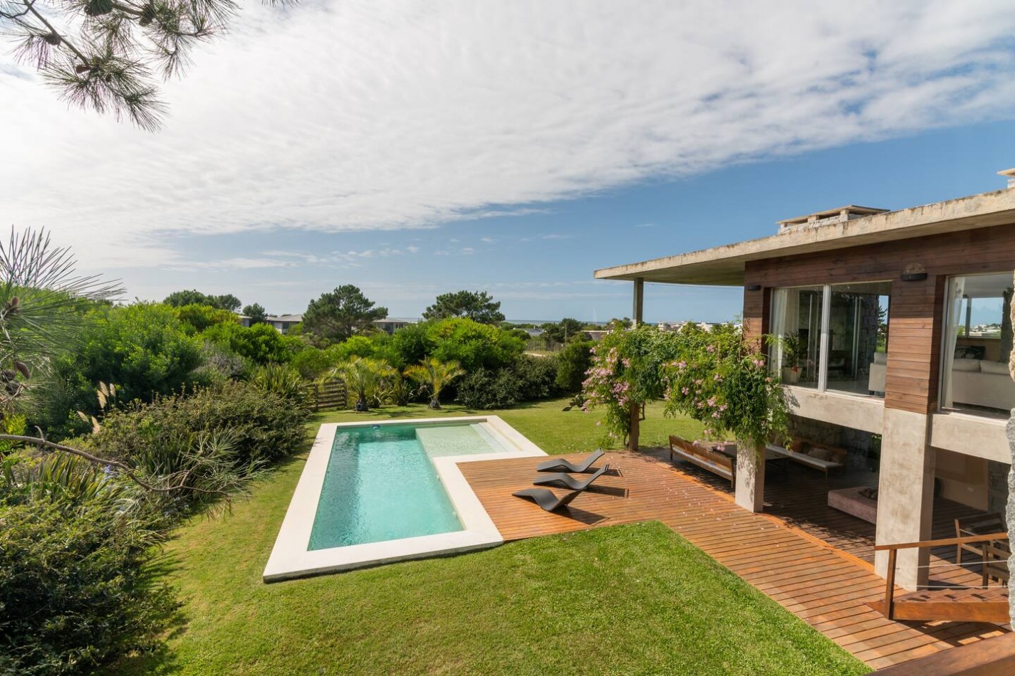 Gran galería con living comedor externo, parrilla deck con piscina climatizada por panel solar.