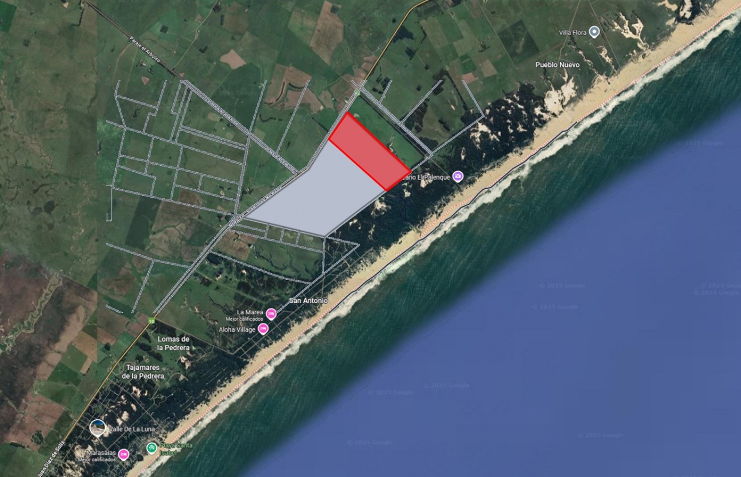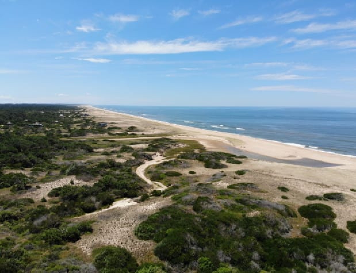 De un lado se recuesta sobre la ruta 10 y del otro sobre la zona de médanos y playa.