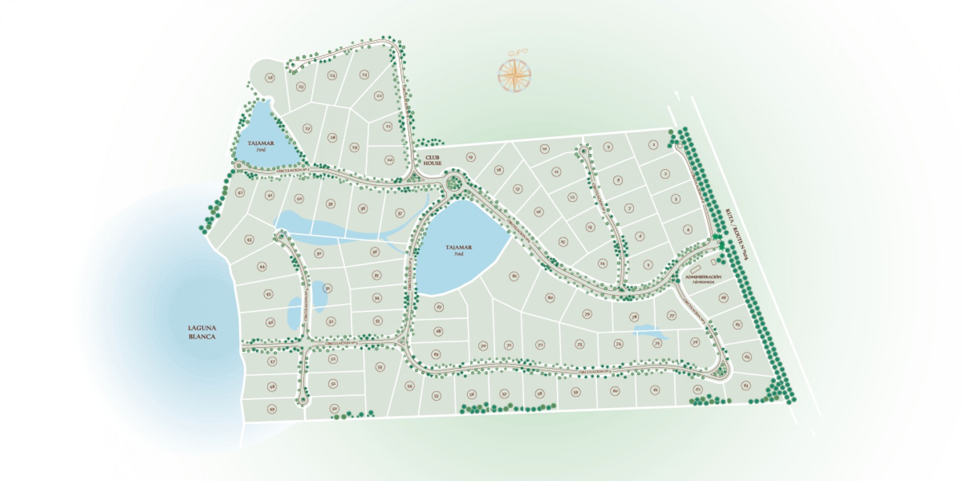 Comprende ochenta y una parcelas maritimas (de 5.000 a 10.000 mts2 cada una) distribuidas en noventa y cinco hectáreas a orillas de la Laguna Blanca, con un entorno paisajístico de excepción.
